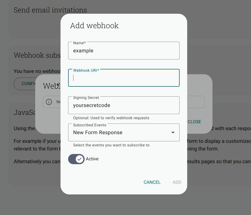 Adding a webhook is quick and straightforward. From your Send section (after publishing your survey or quiz) at the bottom of the page you will find the webhook option. Open the Add webhook menu and fill in the following details: